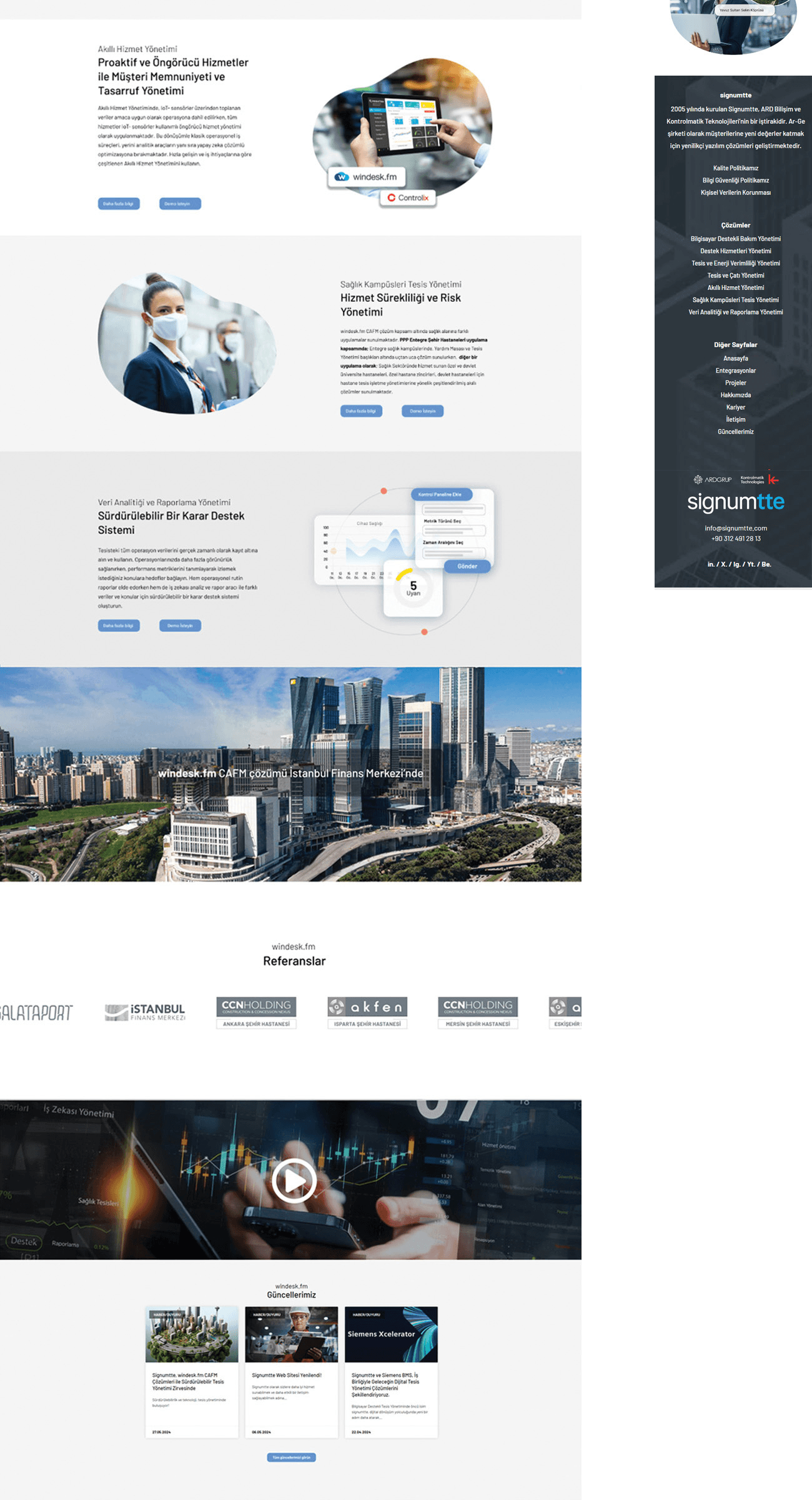 Signum teknoloji için hazırlanan web sitesinde “Windesk Platform”un anlatımının yanı sıra çözümler menüsünün altında yer alan 7 çözüm ve bu çözümlerden Entegre Tesis Yönetimi Çözümü’nün altında yer alan 14 uygulama kullanıcnın anlayacağı bir içerik yapısı ile detaylandırılmış, anlatımlar görselerle, projelerle desteklenmiştir. Minimal bir menü yapısı oluşturulmuş, sitenin basit, ferah, anlaşılır ve kullanıcı dostu olmasına özen gösterilmiş, hiç bir gereksiz sayfa ve yönlendirme kullanılmamıştır. Site üzerindeki geliştirilme çalışmaları devam etmeketir.